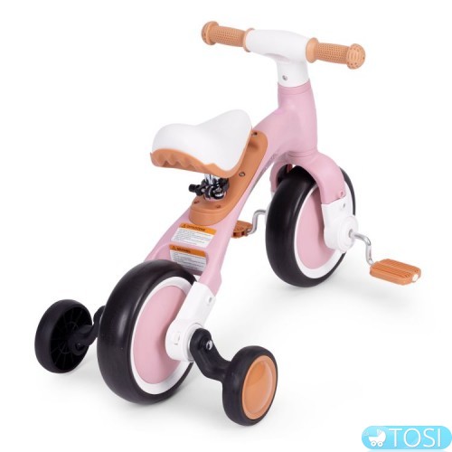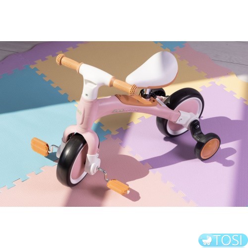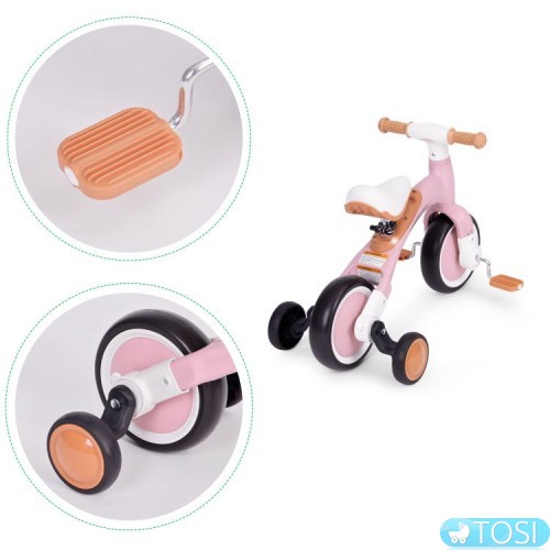 Дополнительные крепежные колеса, которые можно отсоединить, отпустив засов, изготовлены из крепких материалов и обеспечивают надежную поддержку, помогая ребенку сохранять равновесие и уверенность во время вращения педалей. Колеса в велосипеде бескамерны и соответствующей мягкости, благодаря чему велосипед можно использовать как дома, так и на улице.