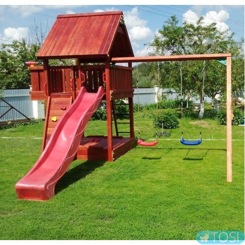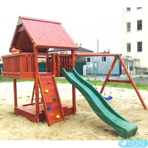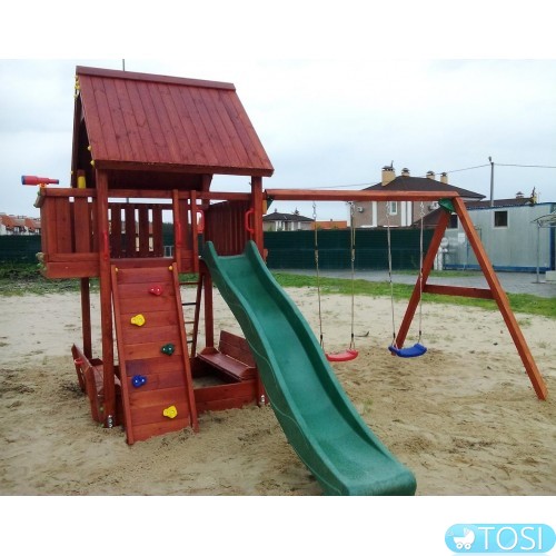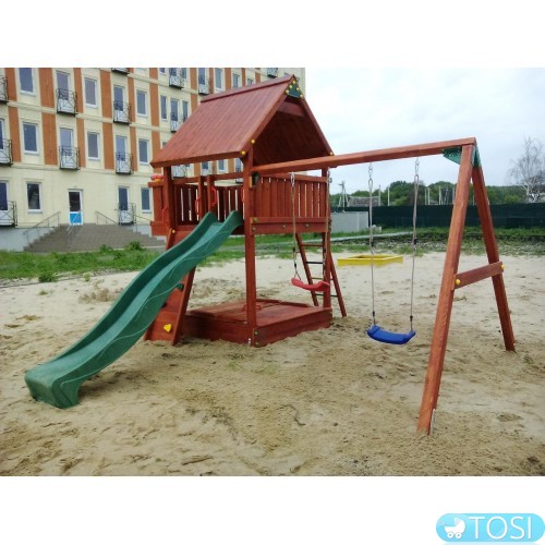 Детская площадка Spielplatz Бруно с двумя качелями, волнистой горкой, лазом для скалолазания, и песочницей-трансформером.