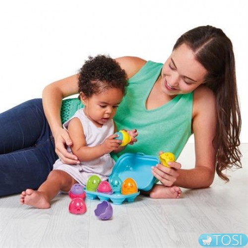 Малышам от 6 месяцев будет интересно открывать яйца и доставать цветных птенцов, а потом расставлять их обратно по скорлупкам и местам в контейнере.