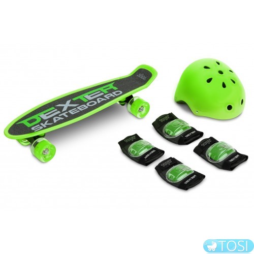 Скейтборд Toyz Dexter - это набор, состоящий из пениборда, шлема и набора защиты.