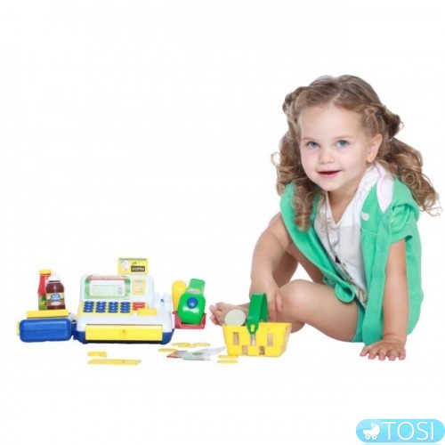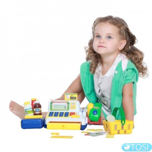 В ігровому наборі: електронний касовий апарат (працює як калькулятор, при натисканні на кнопку CASH зі звуком відкривається грошовий ящик), сканер (пищить при натисканні на кнопку), транспортер для покупок (рухається вручну), корзина для покупок, набір споживача, кредитні картки , купюри, монетки.