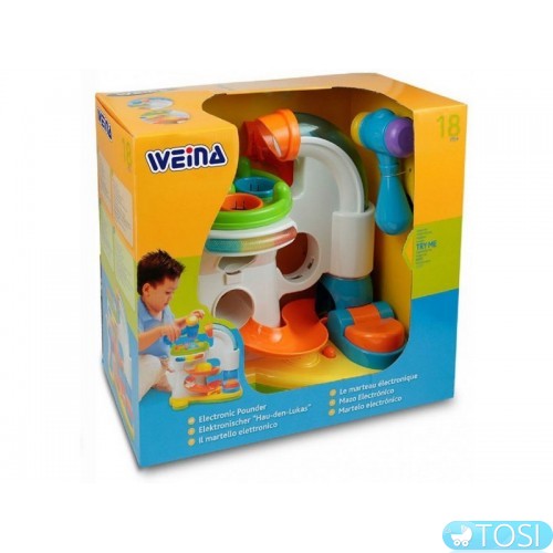Веселая игрушка «Электронный молоток» поможет вашему ребенку развить мелкую моторику, координацию движений и точность. Набор состоит из четырех разноцветных шариков, молоточка и лабиринта. Малышу будет интересно бить по шарику молоточком, когда шарик проваливается, это сопровождается световыми сигналами. Ребенку понравиться наблюдать за двигающимся шариком. Когда шарик выкатывается вниз, малыш может стукнуть по кнопке и мяч, словно из пушки вылетает по трубе наверх и можно начать игру снова. Все это сопровождается световыми и звуковыми эффектами. Игрушка «Электронный молоток» способствует развитию пространственного мышления и слухового восприятия, учит различать цвета. Вызовет у вашего малыша море положительных эмоций.