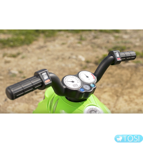 Движется мотоцикл с помощью педалей за счет прочной системы цепного привода, развивая мышцы ног ребенка и координацию движений.