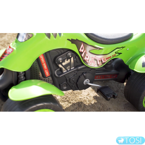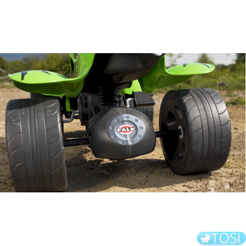 Квадроцикл на педалях Falk Green Pirate 609 – с широкими гоночными колесами, для хорошей устойчивости.