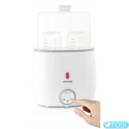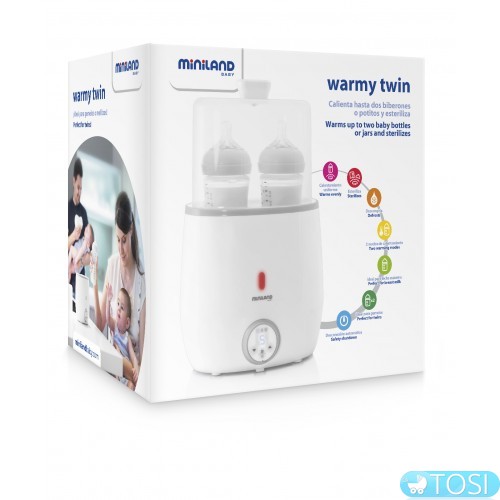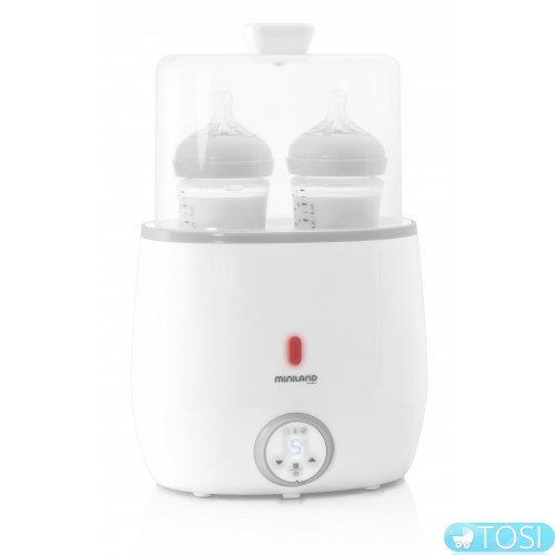 Подогреватель-стерилизатор Miniland Warmy Twin на 2 бутылочки – многофункциональное устройство для стерилизации детских бутылочек, аксессуаров, а также подогрева различных смесей. Это незаменимый атрибут в доме, где есть маленький ребенок. Девайс стерилизует предметы естественным способом, с помощью пара. Сам процесс занимает всего лишь несколько минут. Прибор имеет дисплей, на который выводится информация об оставшемся до завершения процедуры времени. Также имеется функция автоматического отключения. В подогреватель-стерилизатор можно помещать одновременно 2 бутылочки, поэтому он идеально подойдет для родителей двойняшек или близнецов.
