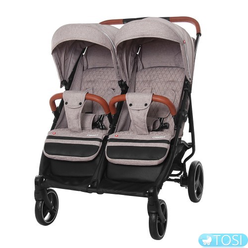 На легкой раме размещено 2 сиденья с независимыми системами регулировки подножек, капюшонов и спинок. Поэтому один малыш может лечь отдохнуть, а второй осматриваться по сторонам.